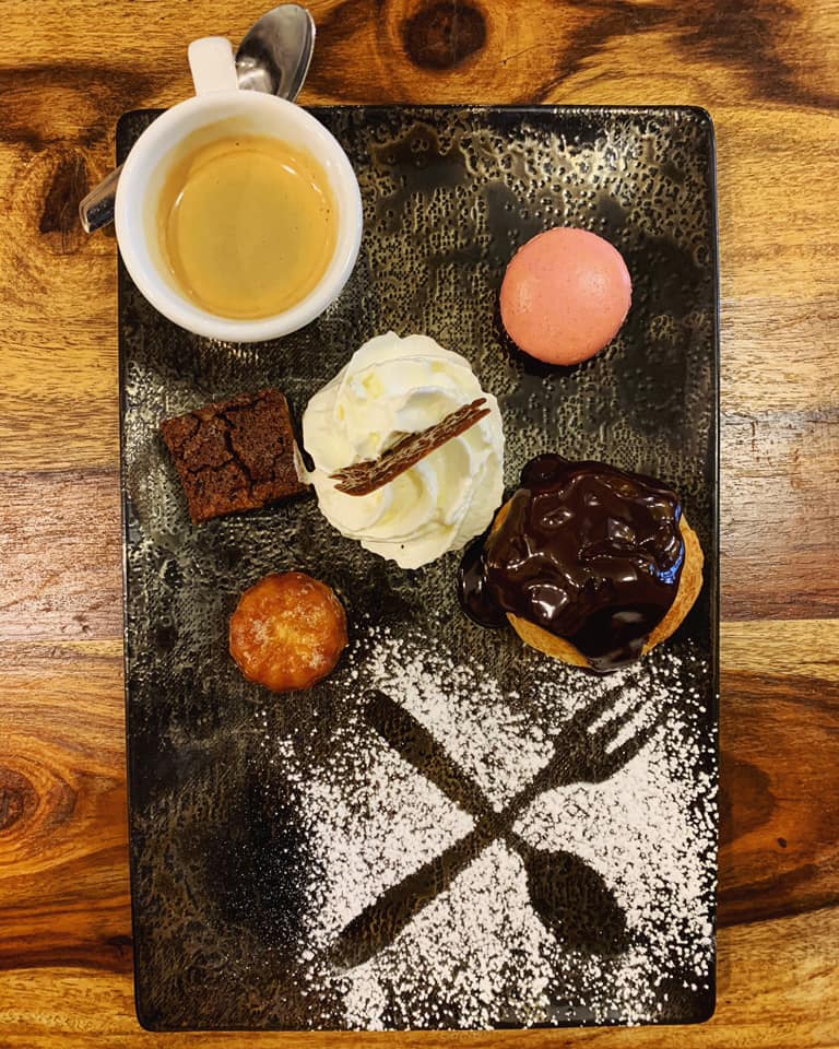 Vanille, tiramisu, café fraichement infusé, pralin, brisures spéculos, coulis chocolat maison, crème fouettée
