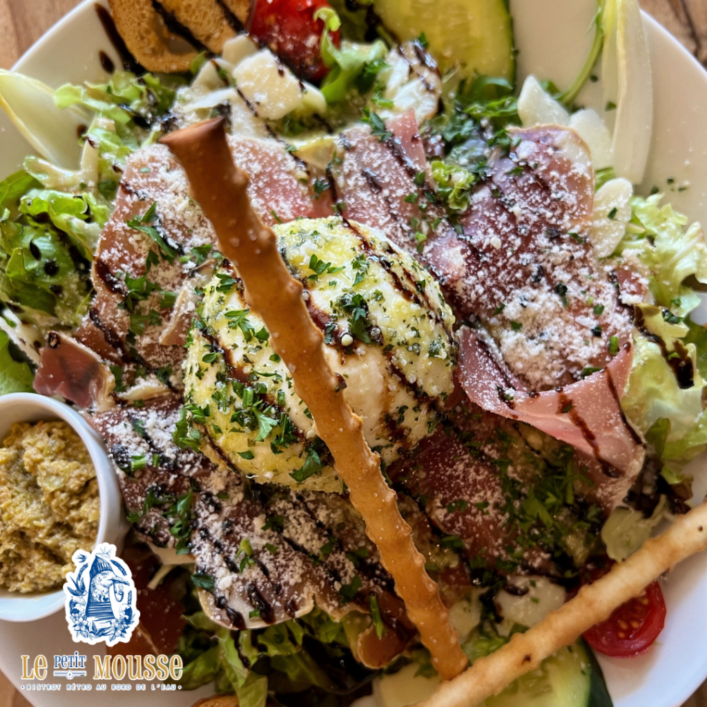 Salade, tomate, tartines de chèvre chaud, jambon cru Serrano, coppa, noix…18,50€